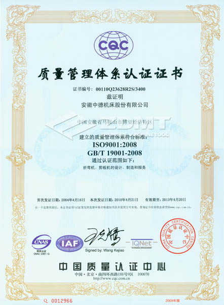 2010年4月,我公司顺遂经由进程了ISO 9001:2008版换证复审,取得认证证书(证书编号:00110Q23628R2S/3400)。在这次复审进程中,中国品质认证中间(CQC)对我公司的品质体系运转环境停止了全方位严酷考核,并对中德公司品质办理任务赐与了充实的必定。